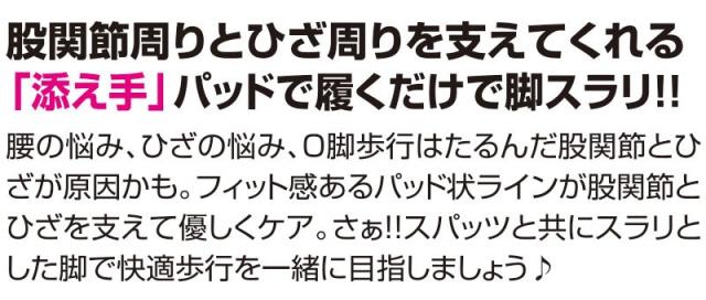 | 商品説明 | 股関節と膝を「パッド状ライン」が添え手のように支えるスパッツ。脚がスラーリすいすい歩こう!年と共に股関節やひざは弱くなり、どうしても外向きにくせがついてしまいます。こんな方に歩きともだち。ひざと股関節にパッド状の着圧ラインを配置、脚が外側に向くことを押さえ、歩きやすいまっすぐ脚を目指します。また太ももに斜めのテーピングラインを入れているので、自然と一歩がまっすぐにでやすくしています。 |