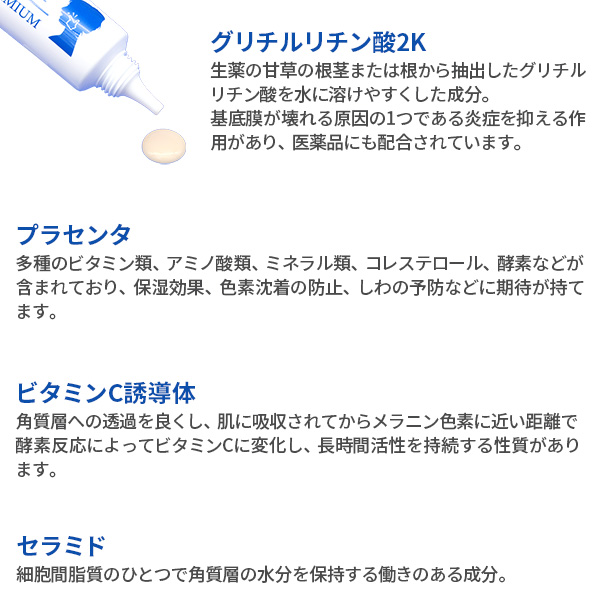 水、ポリ酢酸ビニル、エタノール、ポリビニルアルコール、BG、シリカ、アスコルビルグルコシド、アルブチン、セラミドNP、セラミドAP、セラミドEOP、ヒナギク花エキス、ユキノシタエキス、カミツレ花エキス、ヒアルロン酸Na、オウゴン根エキス、アロエベラ葉エキス、プラセンタエキス、水溶性コラーゲン、グリチルリチン酸2K、スクワラン、フィトスフィンゴシン、コレステロール、ヒドロキシエチルセルロース、カルボマー、キサンタンガム、ラウロイルラクチレートNa、PEG-60水添ヒマシ油、水酸化K、フェノキシエタノール、カラメル
