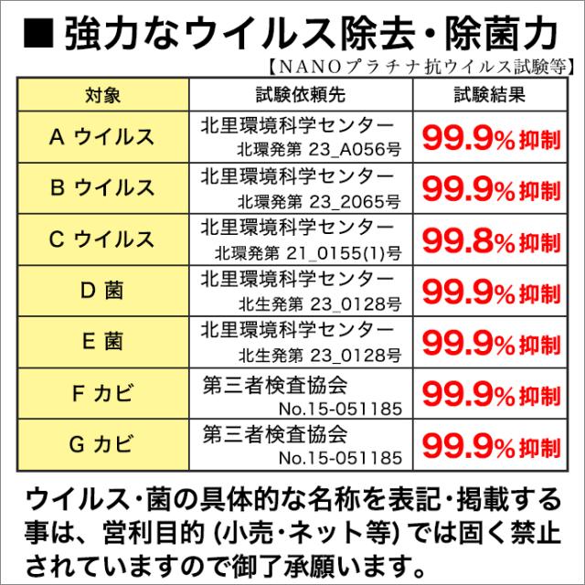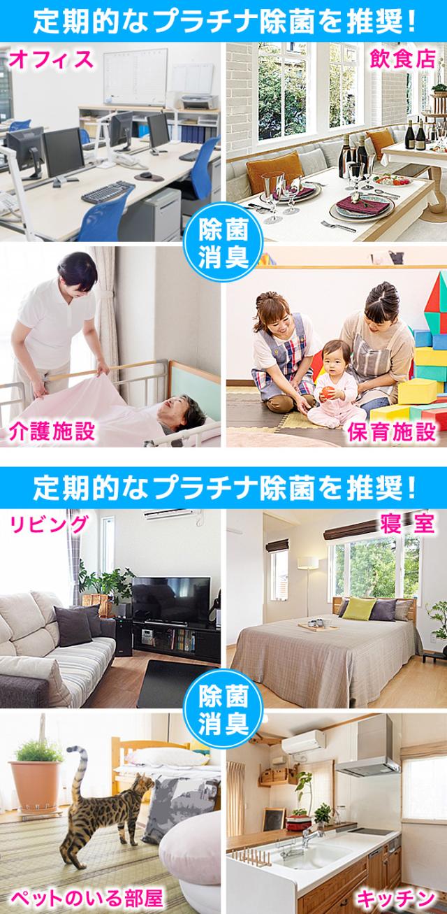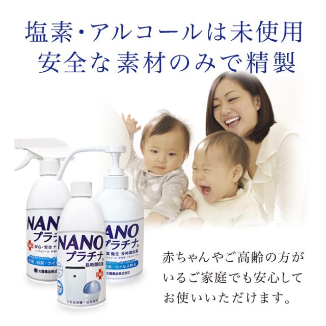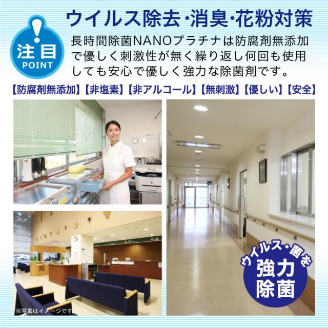 長時間除菌を可能にしたプラチナシールド固定化技術により、塩素やアルコールを使用せず、刺激性が無く優しいNANOプラチナの驚異的な除菌力で長時間の除菌・消臭効果を可能にしました。