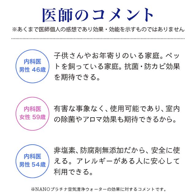 プラチナシールド技術による空気とお部屋のダブル消臭・抗菌。加湿器・アロマディフューザー等内のタンクの水を消臭・抗菌。