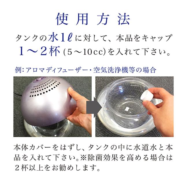 加湿液としてお使い頂く際はタンクの水1Lに対してキャップ2〜3杯を入れて下さい。