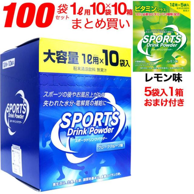スポーツドリンク 粉末 パウダー 100袋セット(1L用×10袋×10箱)+おまけ付き レモン味(1L用×5袋×1箱)