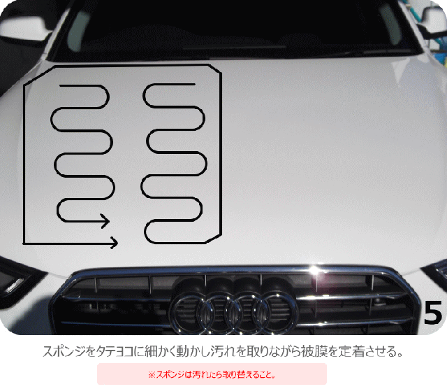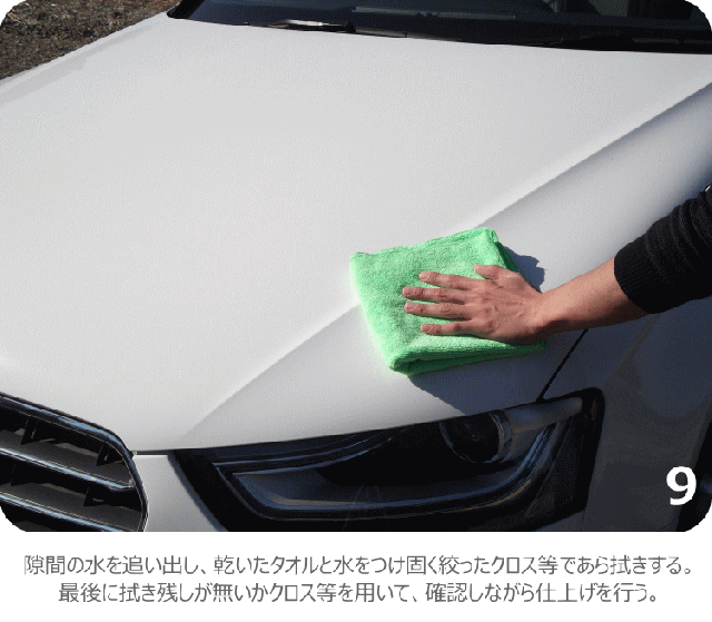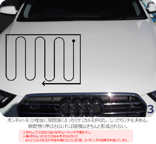 ■作業上の注意 ・全ての作業は日陰で行う方がよい。 ・適量を使うこと。たくさん使いすぎるとかえって仕上がりが悪くなる。 ・劣化したゴム、プラスチックモールなどは極力触らない。白くなった場合はベストブラックを使用してキレイにする。 |