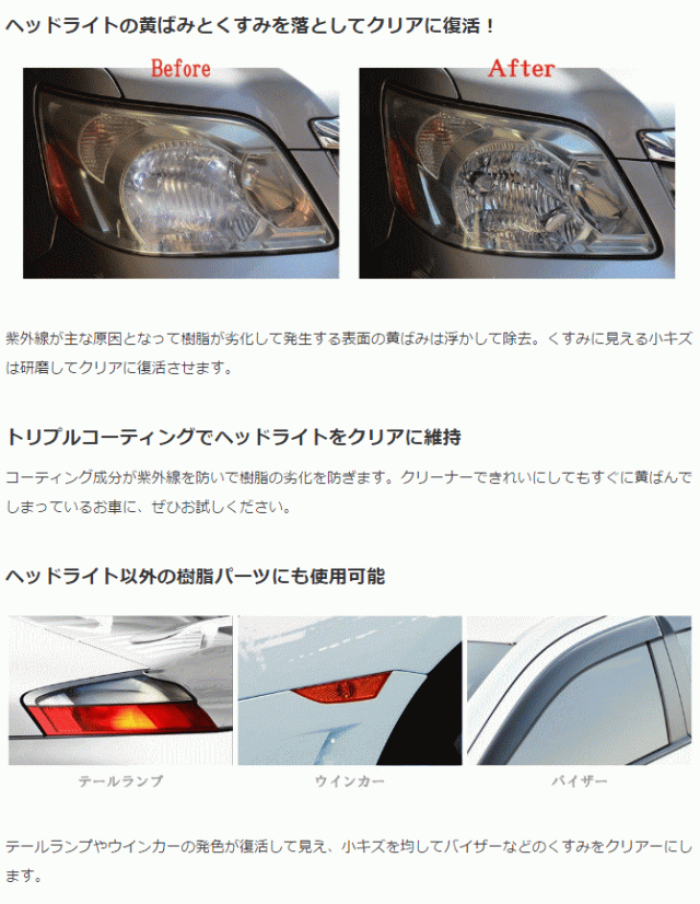 | ヘッドライトの黄ばみとくすみをしっかり落としてクリアに復活!クロスに液剤を付けてこするだけなので誰にでもカンタンに施工できます。 一度綺麗になれば、UVカットトリプルコーティングが紫外線から守るので、クリア感が持続します。 |