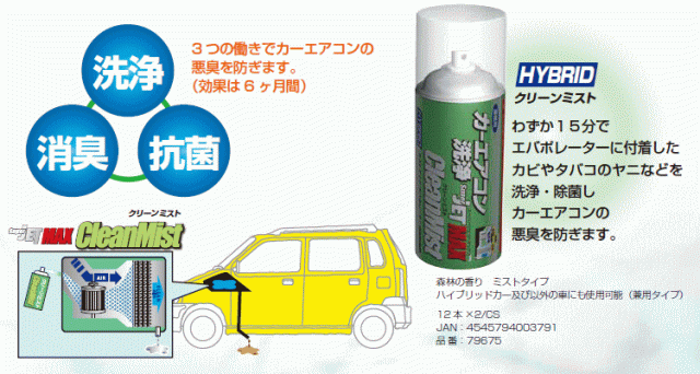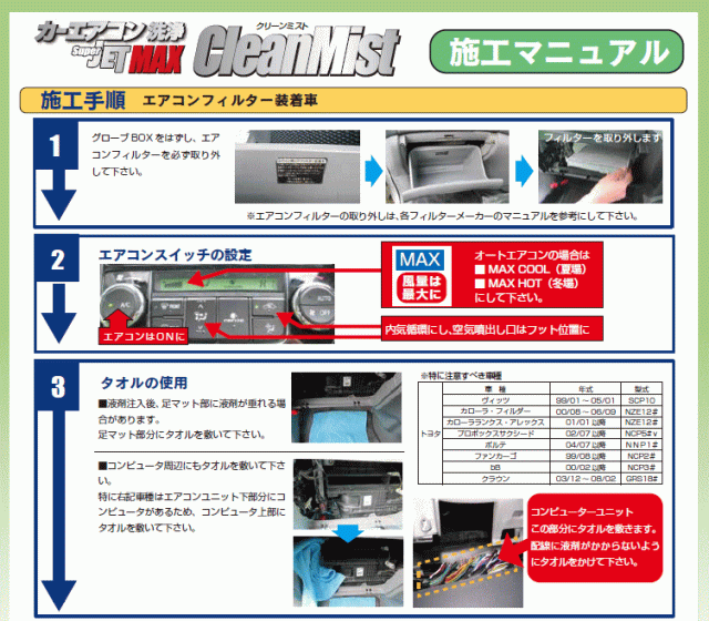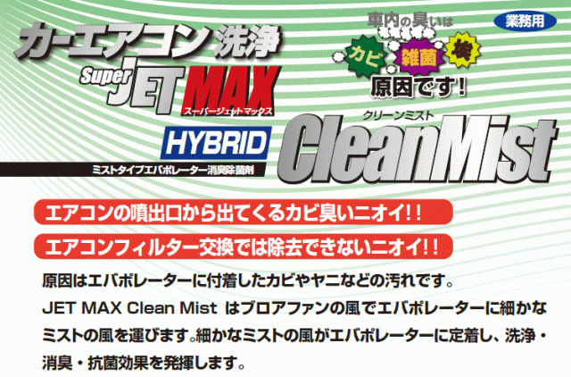 | JET MAX Clean Mist はブロアファンの風でエバポレーターに細かなミストの風を運びます。 細かなミストの風がエバポレーターに定着し、洗浄・消臭・抗菌効果を発祥します。 洗浄・抗菌・消臭の3つの働きでカーエアコンの悪臭を防ぎます。(効果は約6ヶ月間) エアコンフィルター装着車でもエバポレーター周辺の湿気によるカビ臭や喫煙によるタバコ臭により悪臭は発生します。 またエアコンフィルターを施工時に交換するとより効果的です。 1.施工不適切車種 1)輸入車 ■セット内容 ・本体 ・ノズル ・施工日管理ステッカー ・施工マニュアル |