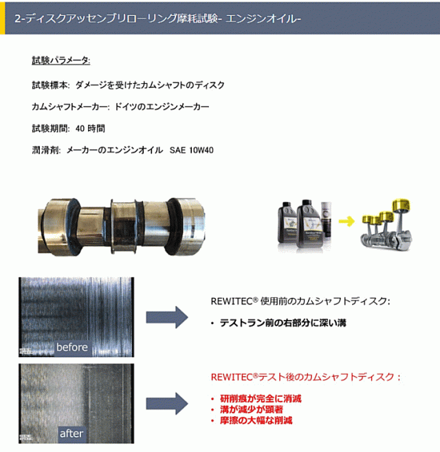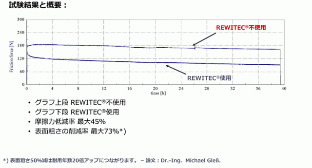 | ・PowerShot S エンジン排気量 1,000cc以下 60ml エンジン排気量 1,001cc〜1,500cc Sサイズを2本使用 ・PowerShot M エンジン排気量 1,501cc〜2,500cc 250 ml ・PowerShot L エンジン排気量 2,501cc〜3,500cc 250 ml エンジン排気量 3,501cc〜4,500cc Lサイズx1、Sサイズx1使用 REWITEC製品は、潤滑油の性質を変えるのではなく、 擦れあう金属表面の構造そのものを変化させます。 シリジウムから形成されるナノおよびマイクロ粒子によるコーティングプロセスでは、金属と化学的に反応したシリジウム粒子が、金属表面にシリカ形成することで 金属表面を修復・保護します。 【セラミック化でフリクションを軽減】 シリジウム粒子が摩擦面にセラミック質を付与することで、フリクションが軽減します。 【摩耗した金属表面を修復・保護】 シリジウム粒子が摩擦によってダメージを受けた金属表面をコーティングし、 修復・保護します。 「Power Shot」「レヴィテック G5」は通常使用で走行距離約50,000km、効果が持続します。 スポーツ走行などをされる場合は、約10,000kmまたは約1年後を目安に、初期の使用料の1/4〜1/2程度をご使用いただくことで、よりコーティング効果が期待できます。 注意事項:本製品後使用後、約1,500kmはオイル交換しないでください。 |