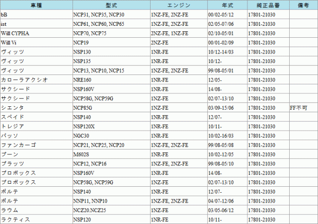 | フィルターの諸元 | |||||