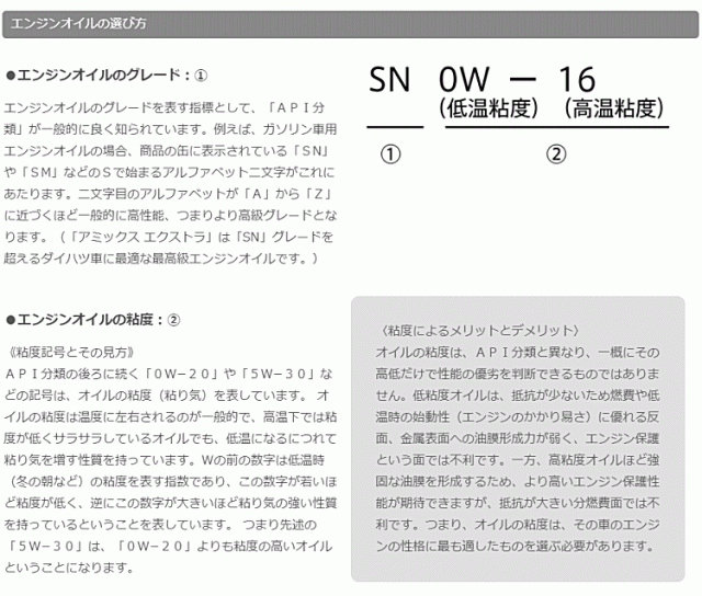 | 「アミックス」エンジンオイル ダイハツ車のオイル交換には、ダイハツ純正の『アミックス』エンジンオイルをおすすめします。 ダイハツの新車には、『アミックス』エンジンオイルが使用されています。このオイルは、ダイハツ車の性能を100%発揮できるよう、車両各部との相性や悪路耐久のような実車試験を含むダイハツ独自の高い評価基準をクリアし専用開発された唯一のエンジンオイルです。つまりダイハツ車は『アミックス』エンジンオイルとの相乗効果によって最高性能を発揮できる訳です。したがって、その後のオイル交換にもこれと同じエンジンオイルを使用することが理想的です。そこでダイハツのお店では、エンジンオイル交換後も限りなく新車時に近い性能を維持できるよう、この『アミックス』エンジンオイルをお奨めしています。商品や車種別適合情報の詳細は、愛車の「取扱説明書」をご覧いただくか、ダイハツ販売店までお問合せください。 |