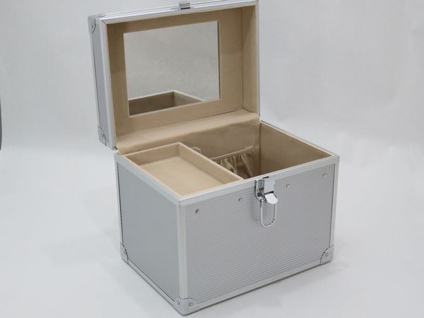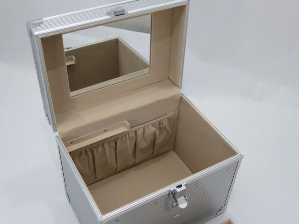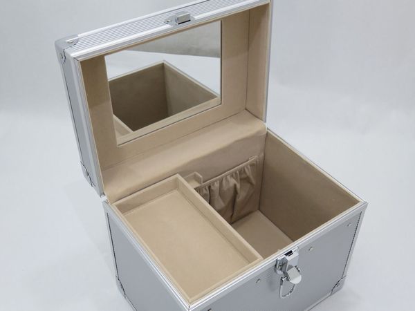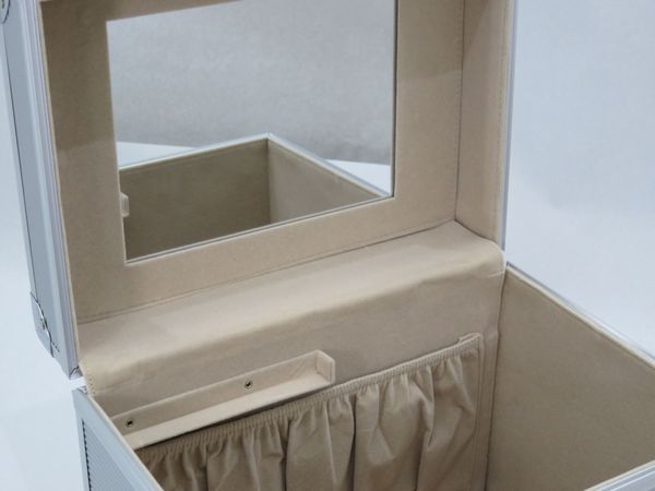 木製の型枠の表面にアルミ板が貼り付けられています。気になる内張りは、スエード調のしっとりとした風合いで、お化粧品はもちろん、指輪や、ネックレスなどの貴金属を入れても安心!!