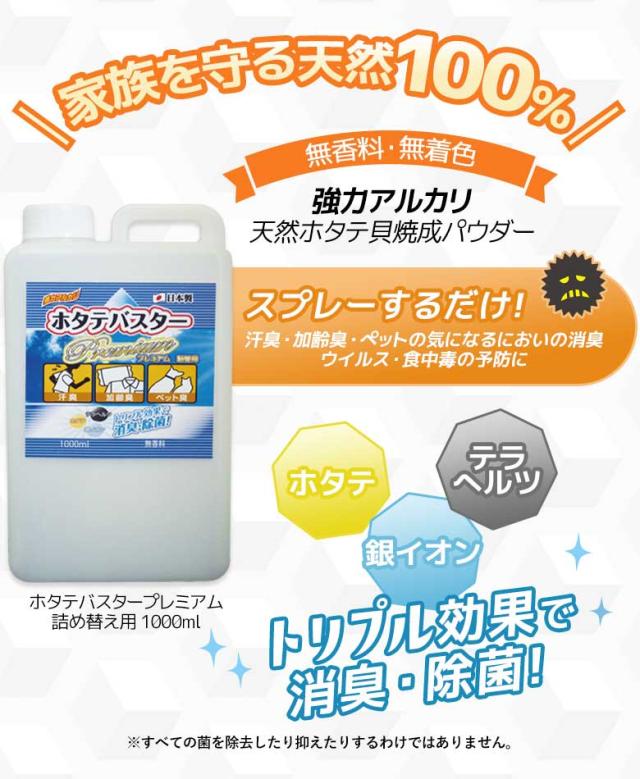 【ホタテバスタープレミアム詰め替え用1L HB-1000P】 1000ml 日本製 除菌 消臭 水酸化カルシウム ホタテ貝殻焼成パウダー 食品添加物 無香料 無添加 安心 安全 天然素材 防災 非常用 ウイルス予防 食中毒予防 ハインズワーク