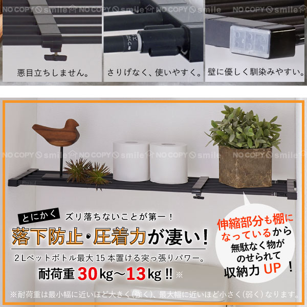 幅(約)63cm〜93cmに伸縮し、長さを固定した後さらにグリップで圧着固定するから、耐荷重は(約)30kg〜13kgと強力。
