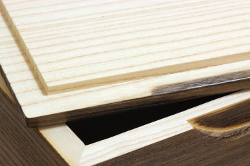 自然な桐の色と焼いた色のコントラスト 外側から焼いていく作業、隙間なくしまっているので境目もクッキリ。 |