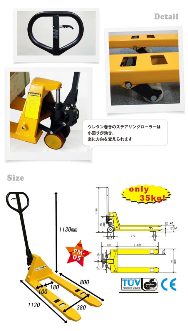 | サイズ | ・全長 1120mm ・フォーク長さ 800mm ・フォーク全幅 380mm ・フォーク爪幅 100mm ・フォーク間 180mm ・フォーク最低/最高高さ=62/150mm |