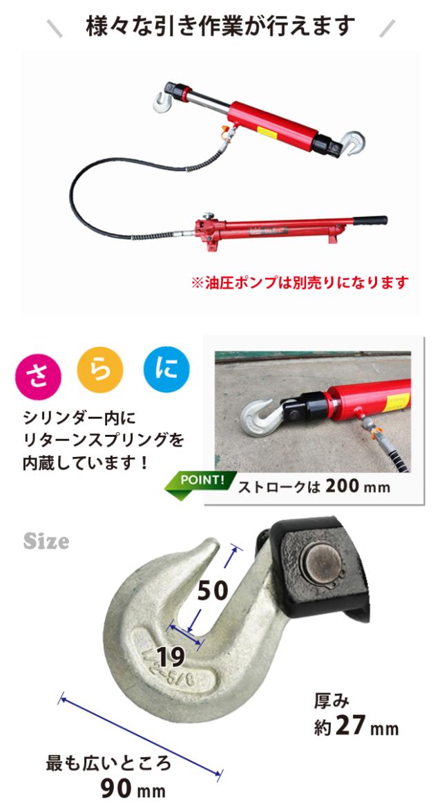 20トンの引きラムです ●様々な引き作業が行えます ●この商品は戻りバネ内蔵の為、圧が抜けるとシリンダーは元の状態まで伸びます ●油圧ポンプは別売りになります ポンプはお手持ちのポンプをご使用になるか別売りのポンプをご使用下さい ※弊社商品の手動油圧ポンプをご利用の場合はオイルの量の関係上、 【手動油圧ポンプ(大)】をご利用いただくことをおすすめいたします ※こちらの商品は木箱に入った状態でお届けいたします ★引きラム10トンもございます 品番:PPH-20 |
