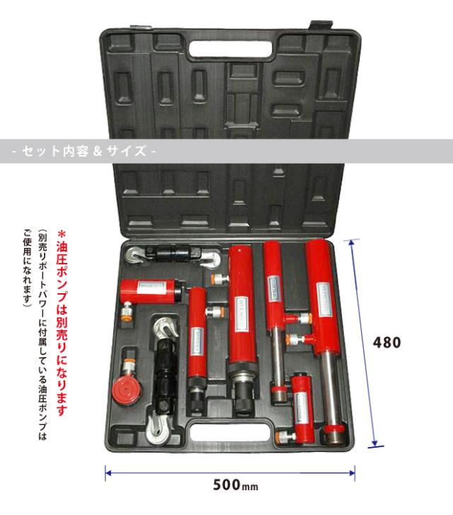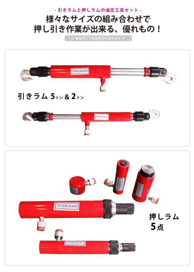 | セット内容 | 【4トン押しラム】ストローク18mm、最小高さ42mm 【10トン押しラム】ストローク57mm、最小高さ132mm 【2トン押しラム】ストローク70mm、最小高さ139mm 【4トン押しラム】ストローク125mm、最小高さ275mm 【10トン押しラム】ストローク150mm、最小高さ350mm 【2トン引きラム】ストローク127mm、最大高さ550mm 【5トン引きラム】ストローク130mm、最大高さ650mm |