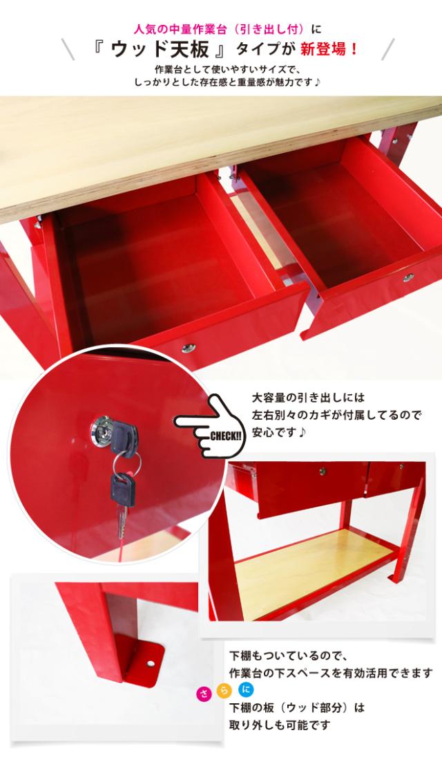 引き出しはベアリング入り! ●作業台として使いやすいサイズです ●天板は強固なプレスウッド38mmの厚板使用 ●引き出しはベアリング入りで動きもスムーズです ●左右別のカギ付きなので、安心です ●足には固定用の穴があるので、設置(固定)しても使えます ●下棚の板(厚み20mm)は取り外しが可能です(スチールの枠は残ります) ●発送荷姿は足を外していますので付属のボルト、ナットで組み立てて下さい (所要時間約20分) ●KIKAIYAロゴステッカー付き ※梱包箱に天板が裏返しで入っておりますので、そのまま逆さの状態で組むと 天板を傷つけにくいです 品番:M-W |