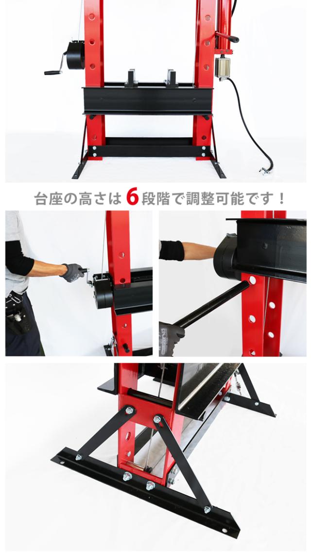 ●エアー手動兼用タイプの油圧プレス50トンです ●シャフトの曲がり修正・芯出し・プッシュ・ベアリングの脱着など、 機械関係や自動車整備など広範囲に活躍できるプレスです ●油圧ポンプはエアー式の為、楽に圧力が上昇し微妙な圧力調整も容易にでき、 作業効率は抜群です(手動で油圧をかける事も出来ます) ●油圧シリンダーに圧力ゲージを取り付けてありますので、圧力を確認しながら 作業出来ます ●シリンダーはリターンスプリング内蔵式のため、レリーズバルブを緩めると 自動で戻ります ●シリンダー先端部の金具は取り外し可能です ●台座の高さ調整は、左側面のハンドウインチで上下の高さ調整ができます ●プレスプレート2個付(写真・黒いプレート) *プレスプレートは取り外しが可能なので、位置を変えたり取り外す事も可能です ●一部組立てが必要となります ●お届けする商品の<シリンダーとポンプ部分>は黒色となります ※50トン仕様ですが、安全上48トンまでとなります 【ご注意】 バルブは緩めすぎないでください(スチールボールが飛び出る可能性があります) ※本機は単発的な修理・サービス用途としてご使用下さい 製造現場や連続運転にはご使用出来ません (保障期間内でも保障の対象外となります) 【関連商品】 ・ホイールベアリングブッシュ 52個セット 保証期間:6ヶ月 使用状況によっては保証対象外となる場合がございますので返送前に 必ずお問い合わせください (保証対象:油圧系統にかぎります) (保証対象外:[例]ダメージやオーバーロードによる変形・ゆがみ等、 使用による車輪の摩耗・水、塩分に起因する故障) 保証期間内の返送運賃はお客様負担でお願いいたします お客様によるイメージ違いでの返品は一切お受け出来ませんので予めご注意ください ※ご購入後、ご不明な点がございましたらお問い合わせください 品番:UPA-50 |