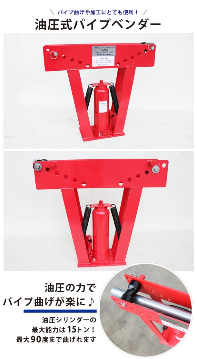 油圧の力でパイプ曲げが楽にできます! ●パイプ曲げや加工にとても便利な油圧式パイプベンダーです ●油圧シリンダーの最大能力は15トン、最大90°まで曲げれます ●ガス管や水道管などのパイプ曲げ・パイプ加工などに使用できます ●本体を寝かして(倒して)使用できるので、長物パイプを曲げる事も可能です