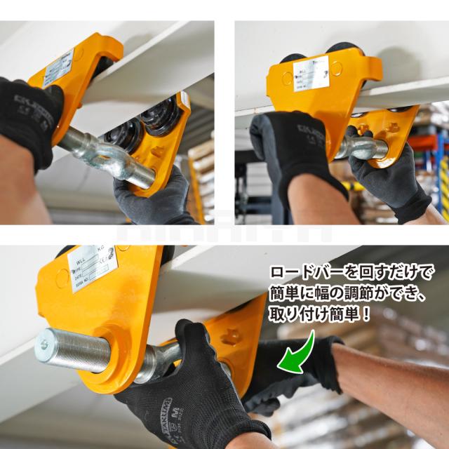 ネジ式なので幅の調節が簡単! ●チェーンブロック用トロリーです ●ネジ式なので幅の調節が簡単! ●フックが上方に取付けできる仕様のため、より高く吊り上げできます ●欧州CE規格取得商品 |