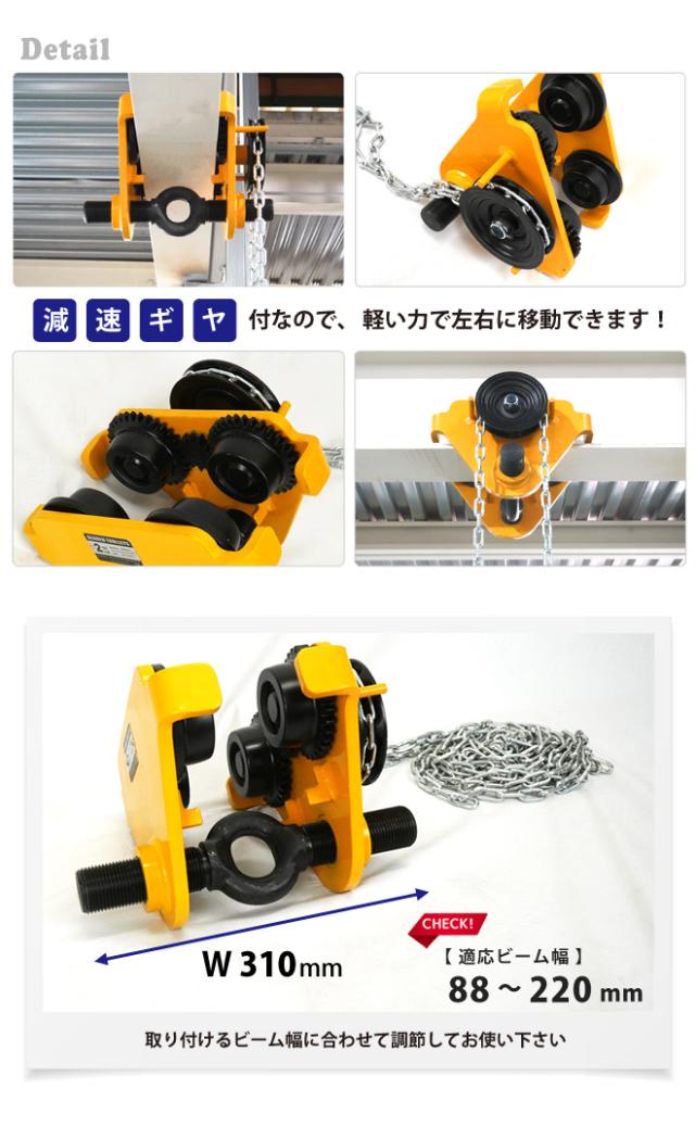 ギヤードトロリーチェーンブロック用 ●幅広いビームサイズに対応します ●減速ギヤ付なので軽い力で左右に移動でき、細かい位置合わせも容易に行えます ●チェーンを1m引くと約 30cmトロリーが横移動します ●移動用チェーン垂れ下がり長さ 2740mm:梁下の高さ4メートル程度までで お使いください ●欧州CE規格取得商品 |