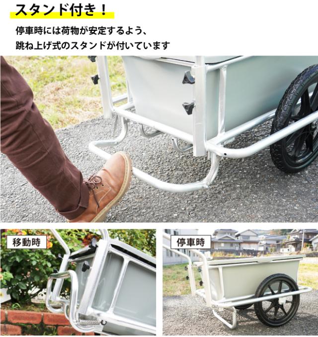 大容量バケット付き!液体も運べるアルミ製リヤカー ●約100Lの大型バケット付き軽量アルミリヤカーです ●ゴミ出しや荷物の運搬など、いろいろな用途に使えます ●バケットは液体も運べる仕様なので、農作業の水やりや収穫などにも便利です ●アルミフレームは軽量でサビに強いのが特徴です ●直径380mmの大型タイヤで不整地や多少の段差も乗り越えられます ●ノーパンクタイヤなのでエアー管理が一切不要です ●停車時には荷物が安定するよう、跳ね上げ式のスタンドが付いています ●バケットは取り外し可能なので、お手入れも簡単 ●バケットの内側には目盛り(90Lまで)が付いています ●長時間使わない場合は分解してコンパクトに収納できます 【ご注意】 この商品はお客様組立てとなります (所要時間15〜20分程度/スパナ【17】2本必要です) 【ご注意】 本製品は車両のため、歩道上を移動運搬しないでください 品番:REC-100 |