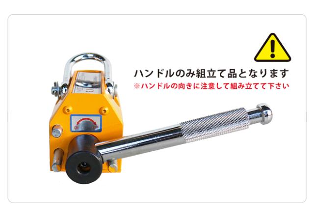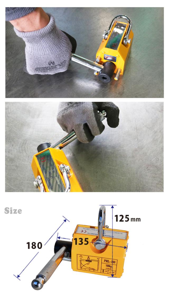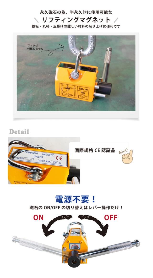 永久磁石の為、半永久的に使用可能! ●磁石のON/OFFは単純レバー操作により行い電源不要 ONの状態はロック付きの安全設計 ●非鉄金属や、吊り荷が無い状態では磁石を使用出来ません ●肉厚12mm以上で75%の能力を発揮し15mm以上で100%に達します ●鉄板・丸棒・玉掛けの難しい材料の吊り上げに便利 ▼使い方 1.吊り上げようとする対象物の上(重心)にマグネットを静かに置く 2.レバーをONにする 3.対象物をゆっくりと地切する程度に吊り上げる 4.木などの棒で対象物をたたいて離れないか様子を見る 5.大丈夫なようならば吊り上げて静かに移動させる 【ご注意】 ・能力以上の物を吊り上げないで下さい ・吊り荷は高く上げないで下さい ・吊り荷の下には絶対に入らないで下さい 塗装した物・縞鋼板はエアギャップが発生して能力が極端に低下します ・斜め吊りは、能力が低下しますのでご注意下さい 製品改良の為、予告なく仕様を変更する場合がございます 【例】(本体の色/若干の形状変更)等 ご使用に問題のない場合(返品/交換)はお受けしておりませんのでご了承ください 関連商品はこちらをクリック |