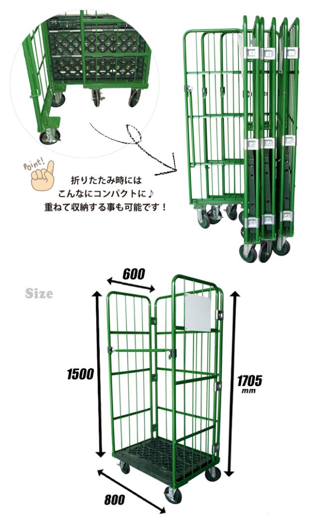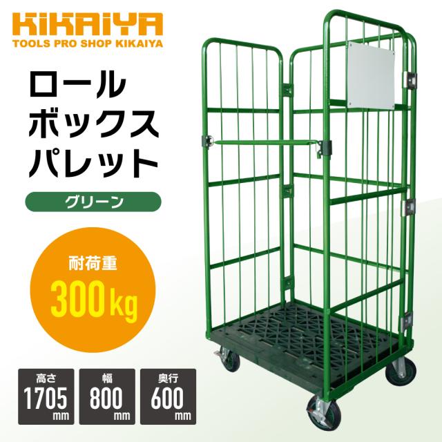 ロールボックスパレット カーゴテナー カゴ台車 W800×D600×H1705mm 耐荷重300kg 業務用 グリーン 緑 折りたたみ ハイテナー 底板樹脂タイプ 大容量 KIKAIYA