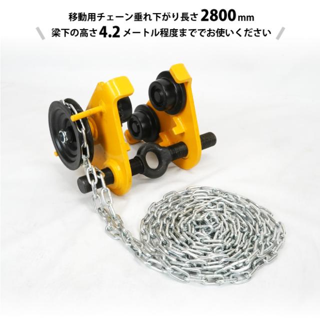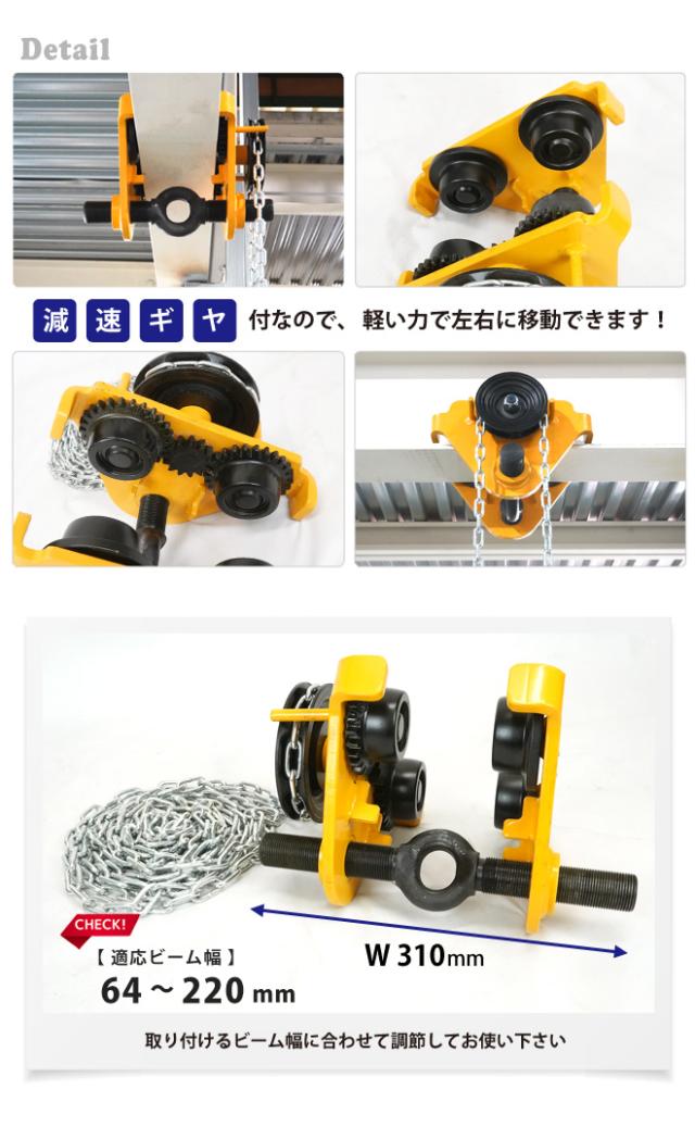 ギヤードトロリーチェーンブロック用 ●幅広いビームサイズに対応します ●減速ギヤ付なので軽い力で左右に移動できます ●チェーンを1m引くと約 30cmトロリーが横移動します ●移動用チェーン垂れ下がり長さ2800mm:梁下の高さ4.2メートルぐらいまでに 対応します ●欧州CE規格取得商品 |