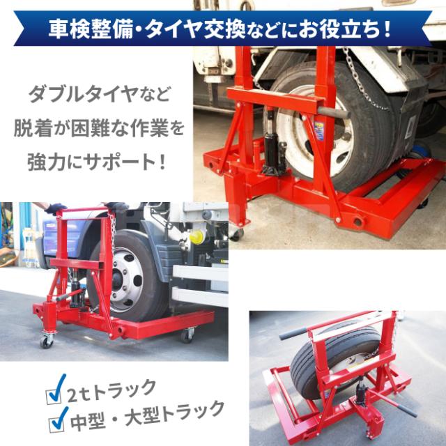2tトラックから中型・大型トラックまでのダブルタイヤなど 脱着が困難な作業を強力にサポート! ●車検整備・タイヤ交換などに重宝します ●上昇・下降は油圧ジャッキでの駆動で楽々、角度調節機構付きで作業性向上、 タイヤ接触部はローラーでタイヤを回転させる事も可能! ●キャスターは全て自在で自由に移動します ●お客様組み立て商品となります ※入荷時期により(カラーや仕様等)画像とは異なる場合も御座います ご使用に問題のない場合(返品/交換)はお受けしておりませんのでご了承ください |
