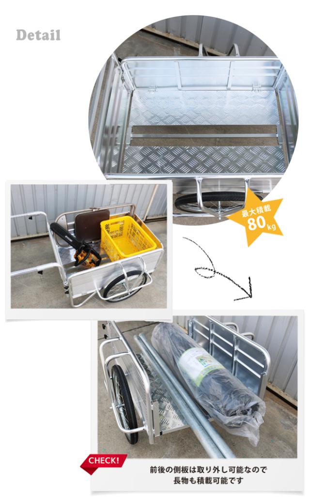 アルミ製のリヤカーは軽量なので移動がらくらく! ●アルミは錆に強いので、水気のある物の運搬にも向いています ●大きい荷台でたくさんの荷物を運べながら、高あおりなので荷こぼれを防ぎます ●20インチの大型タイヤで多少の段差も越えられます ●手回しが可能なノブボルトを使用し、工具無しで組立・分解が可能です ●長時間使わない場合は分解してコンパクトに収納できます (収納に便利なベルト付き) ※この商品はお客様組立てとなります (所要時間2〜3分程度) 【ご注意】 本製品は車両のため、歩道上を移動運搬しないでください 品番:REC-80A |