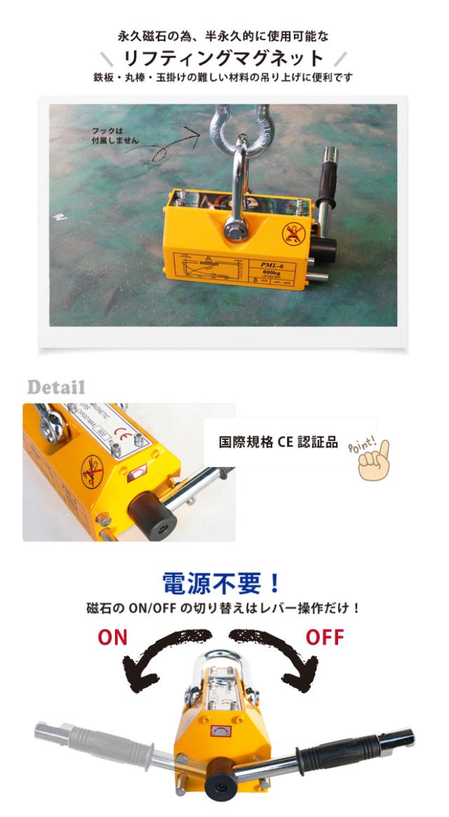 永久磁石のため半永久的に使用可能! ●鉄板・丸棒・玉掛けの難しい材料の吊り上げに便利 ●磁石のON/OFFは単純レバー操作により行い電源不要 ONの状態はロック付きの安全設計 ●非鉄金属や、吊り荷が無い状態では磁石を使用出来ません ●肉厚15mm以上で75%の能力を発揮し30mm以上で100%に達します ▼使い方 1.吊り上げようとする対象物の上(重心)にマグネットを静かに置く 2.レバーをONにする 3.対象物をゆっくりと地切する程度に吊り上げる 4.木などの棒で対象物をたたいて離れないか様子を見る 5.大丈夫なようならば吊り上げて静かに移動させる 【ご注意】 ・能力以上の物を吊り上げないで下さい ・吊り荷は高く上げないで下さい ・吊り荷の下には絶対に入らないで下さい 塗装した物・縞鋼板はエアギャップが発生して能力が極端に低下します ・斜め吊りは、能力が低下しますのでご注意下さい 関連商品はこちらをクリック |