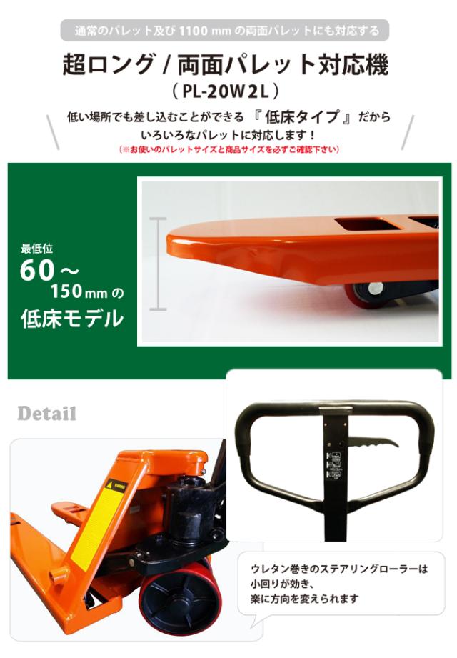 ローラー軸は全てベアリング入りで移動がラク! 1100mmの両面パレットにも対応する優れモノ!! ●フォーク幅が685mmと幅広なので、安定感があります ●低床60mmでさまざまパレットの移動や作業に対応します ●ステアリング/フォークローラーともポリウレタン巻きで床にも優しく傷付きの心配がありません ●ローラー軸は全てベアリング入りで移動がラクラク ●工業製品国際規格GS/TUV/CEマーク全て取得の一級品です ※商品は組立済みの状態でお届け致します ※外見保証はございません (輸送中による細かいキズ、ローラー表面の汚れ等は予めご了承ください) 【 ※ご注意※ 】 屋内でのご使用をお願いします 万が一、屋外で使用の場合、錆びが発生し、製品に不具合(上昇しない等)が生じます 保証対象外となりますので、十分ご注意ください ※能力以上の荷物は上昇・下降させないで下さい ※能力以上の荷重がかかると、安全弁が作動し本体を保護します ※部品の供給は致しております ★フォークローラーはこちら ★ステアリングローラーはこちら *サイズをよくご確認の上お間違いのないようご注文をお願いいたします プラスチックパレットはこちら 安心の3ヶ月保証 使用状況によっては保証対象外となる場合がございますので 返送前に必ずお問い合わせください (保証対象:油圧系統にかぎります) (保証対象外:[例]ダメージやオーバーロードによる変形・ゆがみ等、 使用による車輪の摩耗・水、塩分に起因する故障) 保証期間内の返送運賃はお客様負担でお願いいたします お客様によるイメージ違いでの返品は一切お受け出来ませんので予めご注意ください 【ご注意】 工事中の工事現場への配達はできません。西濃運輸営業所止めとなります。予めご了承ください。 品番:PL-20W2L |