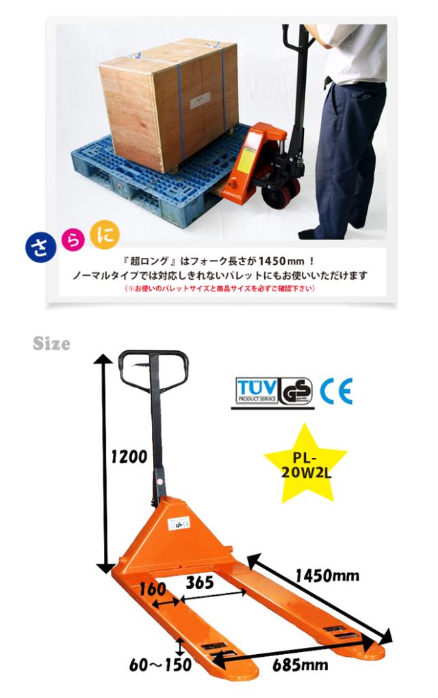 ハンドリフト 2000kg 超ロング 両面パレット対応機 フォーク長さ1450mm フォーク全幅685mm 高さ60mm ハンドパレット パレットトラック KIKAIYA