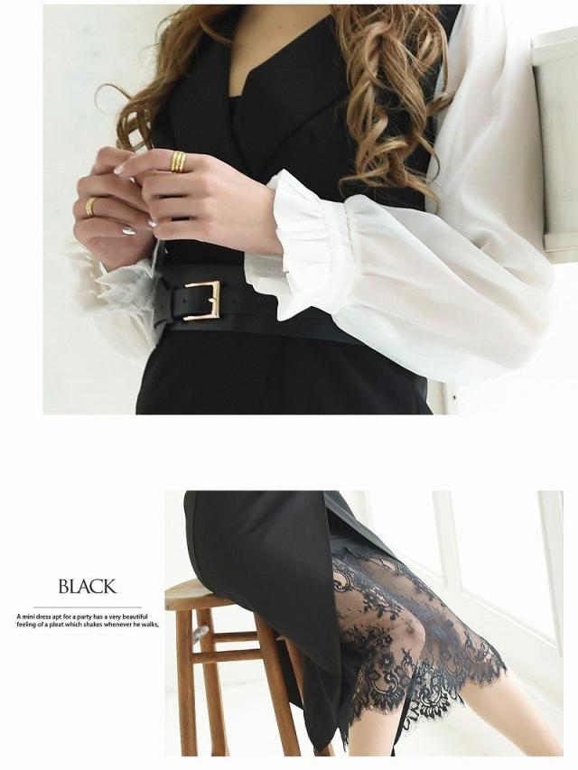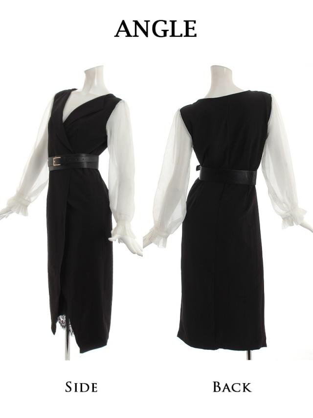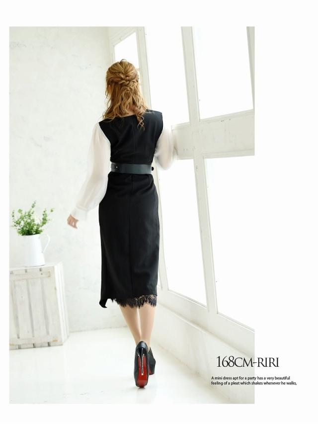☆大人可愛いモノトーンのフリル袖ドレスはベルトがセットになったタイトキャバドレス
