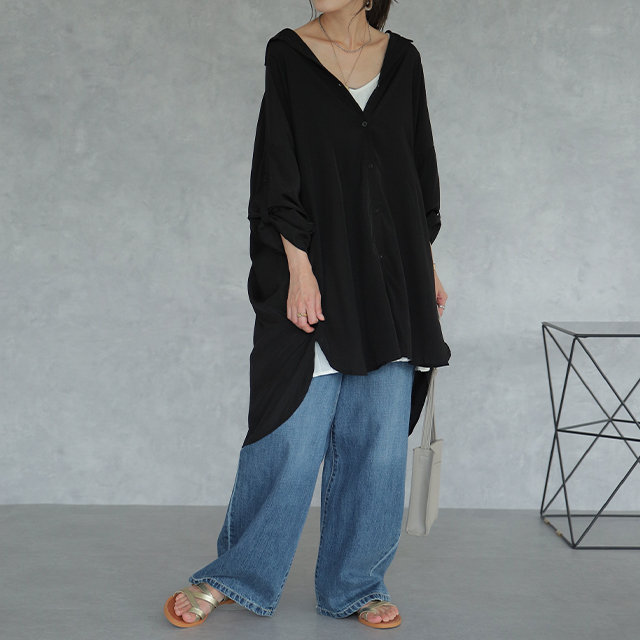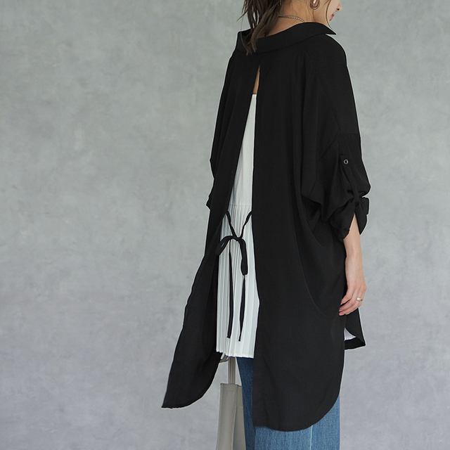 ロールアップ ミディアム ミドル シアー感 シルク風 抜け感 透け感 ゆったり シンプル 細リボン 無地 シンプル きれいめ キレイめ 抜き襟 五分袖 5分袖 7分袖 七分袖 チュニック 長め 長い スタンドカラー ビッグ ビック オーバーサイズ 背中リボン 後ろリボン 彼シャツ ビックシルエット ビッグシルエット オフィスカジュアル ブラック ホワイト 白色 黒色 20代 30代 40代 50代 おしゃれ 母の日 お洒落 オシャレ かわいい 可愛い カワイイ 春夏 春 夏 秋 冬 秋冬 フリーサイズ M L XL XXL 2L 3L HUG.U HUGU ハグユー はぐゆー