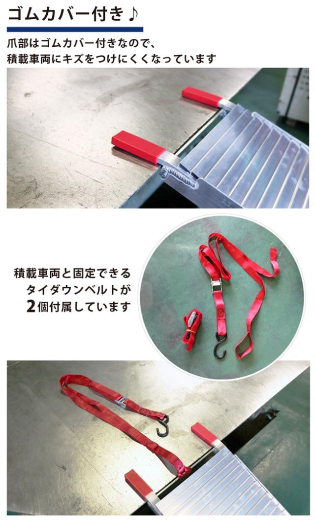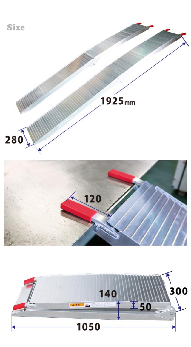 軽量&折りたたみ式で持ち運びに便利! ●バイク・農機具・ATVなどを積込みする際に便利な、軽くて強いアルミラダーです ●レール表面は滑りにくい形状になっており、トラック等へ安全に積込みできます ●爪部はゴムカバー付きなので、積載車両にキズをつけにくくなっています ●折りたたみ式なので、場所もとりません ●積載車両と固定できるタイダウンベルトが2個付属しています ●軽量なので女性でも持ち運びが可能です ※地面からの高さ(段差)70cm以内でご使用下さい ※固く平らで、傾斜のない土間の上でご使用下さい ※ご使用前にはスロープと荷台等を安全ベルトで固定して下さい *インポート品のため、製造過程で外見に傷、ヘコミがある場合がございますが 性能上、問題ございません 外見保証はございませんので予めご了承ください 品番:AS-300 |