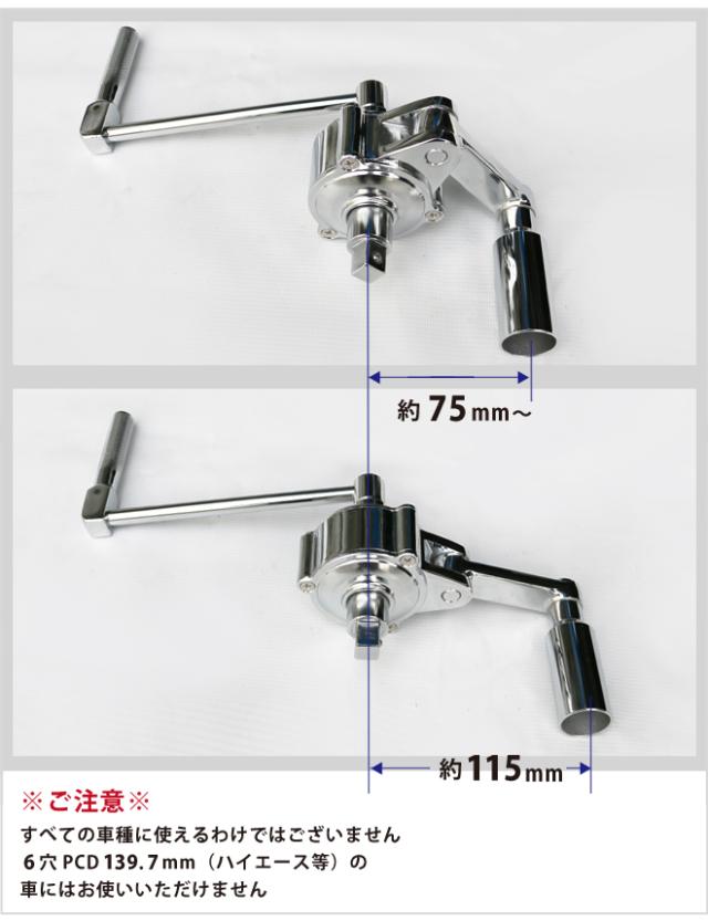 あると便利!乗用車用16倍のギアレンチ! ●硬く締まったホイールナット・ボルトを、16倍の力で簡単に緩めることができる 乗用車用ギアレンチです ●少ない力でナット・ボルトを楽々緩める締めることができます ●乗用車のタイヤ交換/ホイール交換の際に役立ちます ●車載しておけばパンクなどの緊急時に大変便利です ●車載や保管に便利なブローケース付です ※すべての車種に使えるわけではございません (製品のソケットサイズを必ずご確認下さい) ※6穴PCD139.7mm(ハイエース等)の車にはお使いいただけません ※締め付けには必ずトルクレンチをご使用ください ※最大トルクは目安値です、条件によりトルク値は変動します 品番:GW-4 |