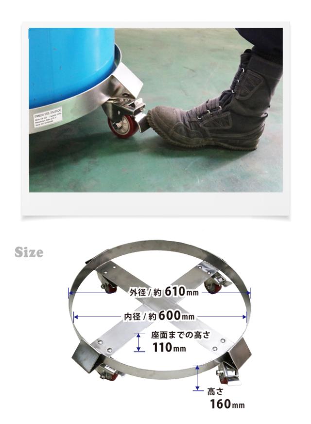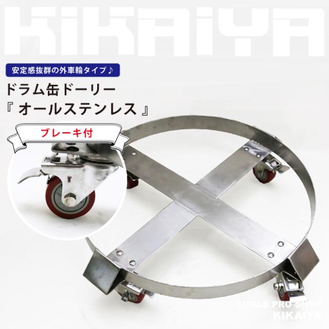 ドラム缶ドーリー オールステンレス ブレーキ付 最大荷重400kg ドラム缶台車 ドラムキャリー 円形台車 ワイドタイプ クリーンルーム KIKAIYA
