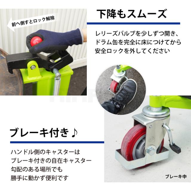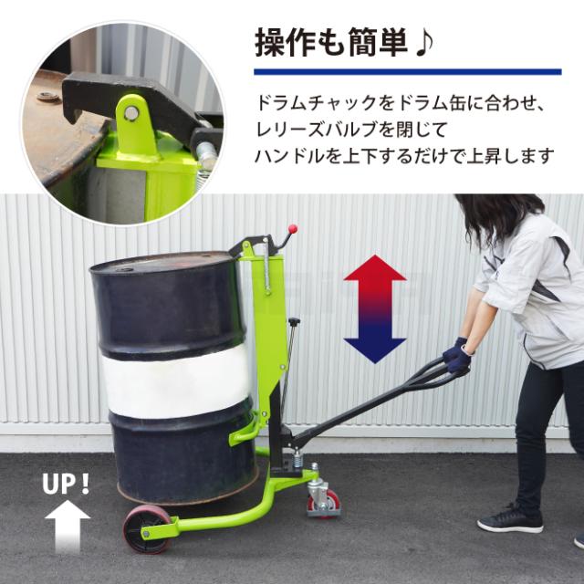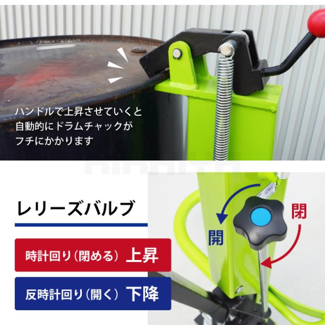 重いドラム缶をすごく楽に上昇させ移動もスムーズ! ●ドラムチャックをドラム缶のフチに合わせてハンドルを上下するだけで 重いドラム缶を軽々上昇させ移動もスムーズ、女性でも操作可能です ●床から最大260mmの高さまで上昇できるので、 そのまま台車やパレットに 乗せる事が出来ます ●鋼製200L缶のクローズタイプのドラム缶に使用可能です ●空ドラムは軽いので、持ち上げる時は手で軽く押さえて爪をかけてください (空ドラムは移動時に振動で外れる事がございますので、ご注意下さい) ●キャスターはストッパー付で勾配のある場所でも勝手に動きません ●樹脂ドラム缶⇒使用不可 ●スチールオープンドラム缶⇒使用不可 (蓋を外した状態⇒使用可能) ※サイズをよくご確認の上、お間違いのないようご注文をお願いいたします お客様によるイメージ違いでの返品は一切お受け出来ませんので予めご注意ください ※高さが875mm以下のドラム缶にはお使いいただけませんので、ご注意下さい *商品は組立済みの状態でお届け致します *外見保証はございません(箱の損傷等は予めご了承ください) ※本品は運送会社の諸事情により配達時間指定サービスと日・祝日の配達は 行っておりませんのでご了承ください 製品改良の為、予告なく仕様を変更する場合がございます 【例】(本体の色)(ケースのサイズ・色・形)等 ご使用に問題のない場合(返品/交換)はお受けしておりませんのでご了承ください 品番:DHR-10 |