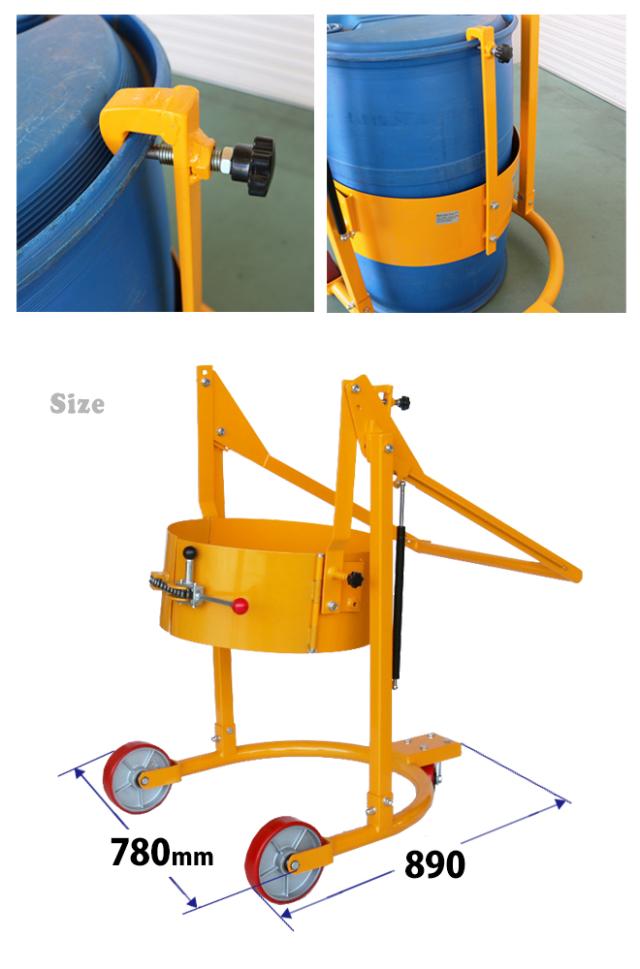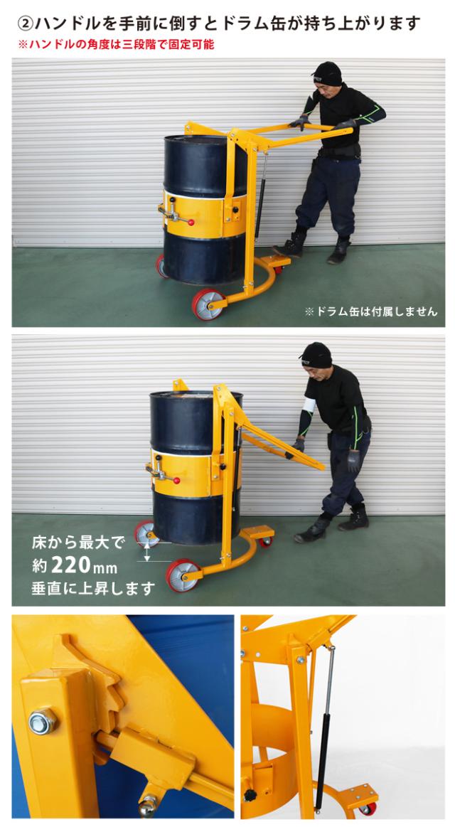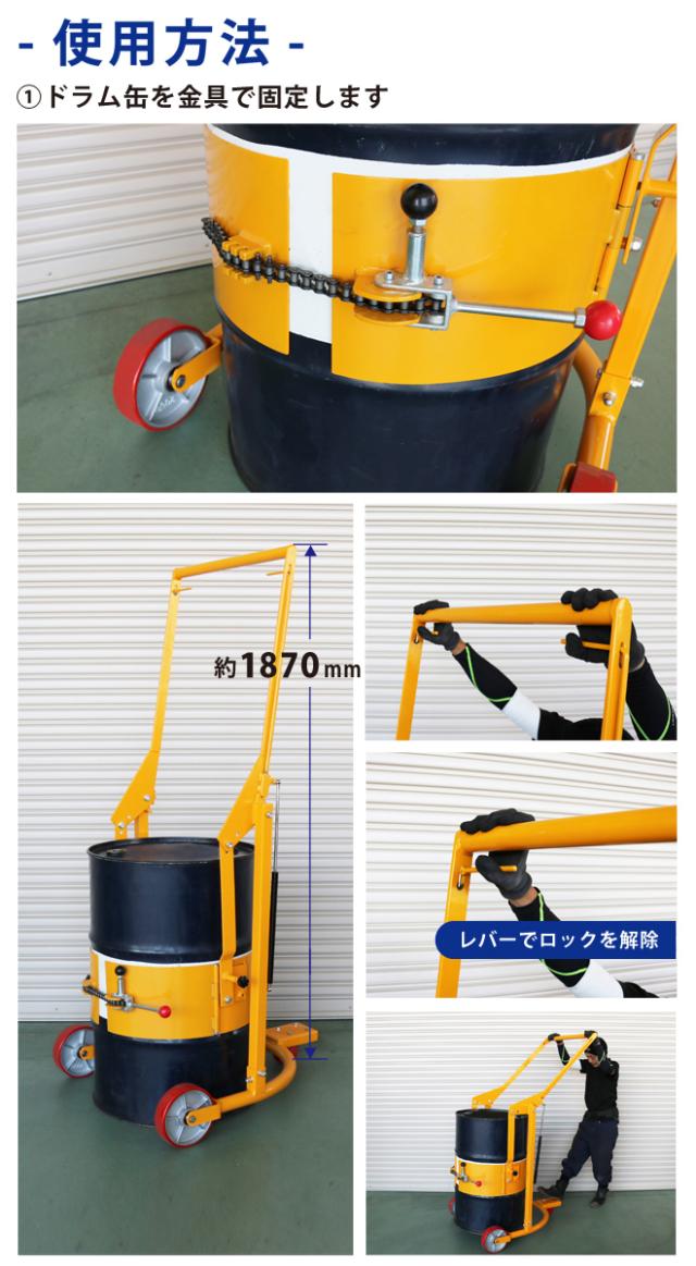 ドラム缶の運搬と反転が可能な運搬台車! ●ドラム缶の運搬と反転作業の二役が一台で行える、ドラム缶運搬車です ●固定ハンドルの操作でドラム缶を素早く締め付けてしっかりと固定します ●3輪台車で扱い易く、移動時にも負担を軽減させ楽に作業できます ●車輪が大きいので移動が楽に行えます ●樹脂ドラムにもお使いいただけます(樹脂ドラム用固定金具付き) ※オープン樹脂ドラムにはお使いいただけません ●ドラムを反転(横倒し)した時の、床からドラム側面までの高さは約370mmです ●商品はお客様自身で組立てをお願いします(約20〜30分) ▼使用方法 1.ドラム缶を移動するときには金具でドラム缶を固定します 2.ハンドルを手前に倒すとドラム缶が持ち上がります ※ハンドルの角度は手前に3段階で固定できます(ロック可能) ※ロックがかかるとカチッと音がします 危険ですので、途中で急に手を放さないで下さい 3.ドラム缶を移動しつつ、ドラム缶の反転作業が可能です ※0度、90度でロック可能です ※安全の為、2人で作業を行って下さい ※比重の重たい材料(鉄スクラップ等)が入ったドラム缶は使用しないでください ※力の強さは個人差がありますので、女性や力が弱い方はお使いいただけない場合が ございます ※1〜2cm上昇させ、クランプが確実にきいていることを確認して下さい ※周囲の状況に充分注意して安全に作業をして下さい *入荷時期により本体色が異なる場合がございます ご使用に問題のない場合(返品/交換)はお受けしておりませんのでご了承ください ★「ドラム反転機/ドラム缶反転吊り具」はいろいろな種類を取り揃えております 品番:DHR-14 |
