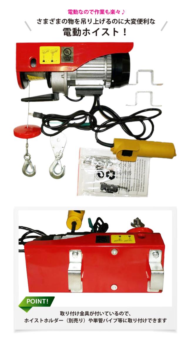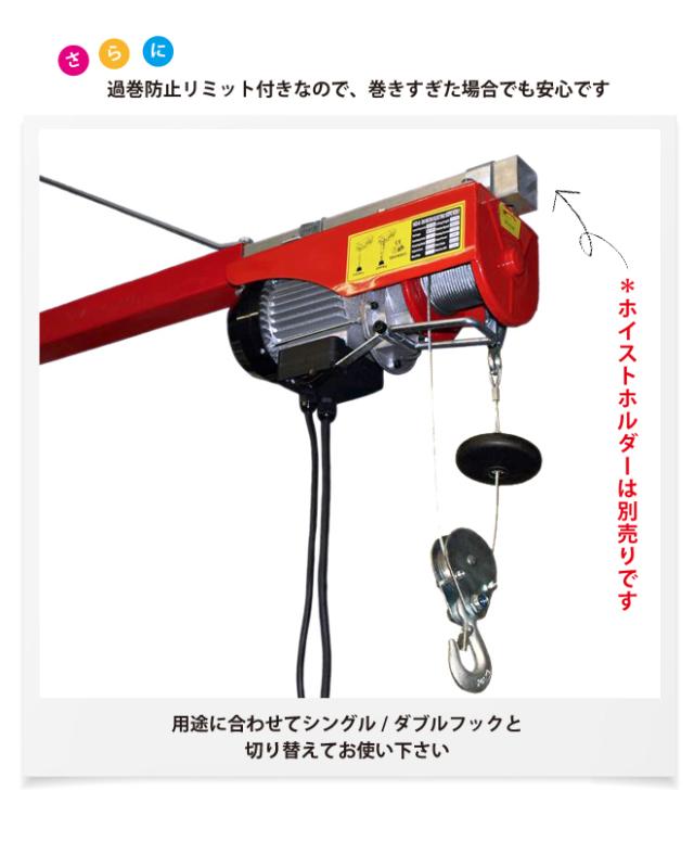 物の吊上げに/工場内や現場作業で大活躍! ●さまざまの物を吊り上げたり、現場作業にも使えます ●電動ホイストは単管パイプや角パイプ(45mm以下)にも取付できます ●過巻防止リミット付きです 万が一、巻きすぎた場合でも過巻防止リミット付きなので安心です ※バッテリーインバーターでのご使用はできません *ホイストホルダーは別売りです |