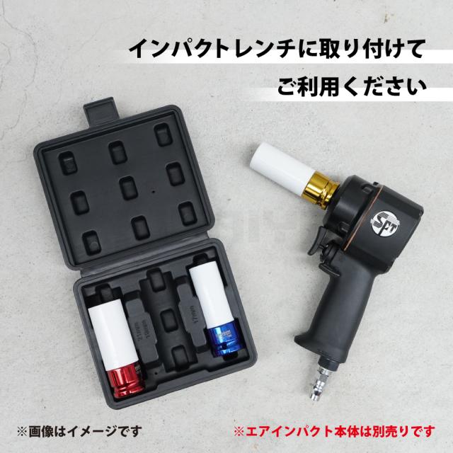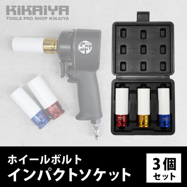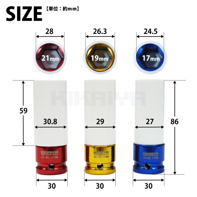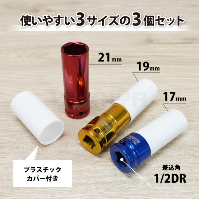 インパクト ソケット タイヤ交換 3個セット 17mm 19mm 21mm 1/2DR プラスチックカバー付き 全長86mm ホイールナットソケット KIKAIYA