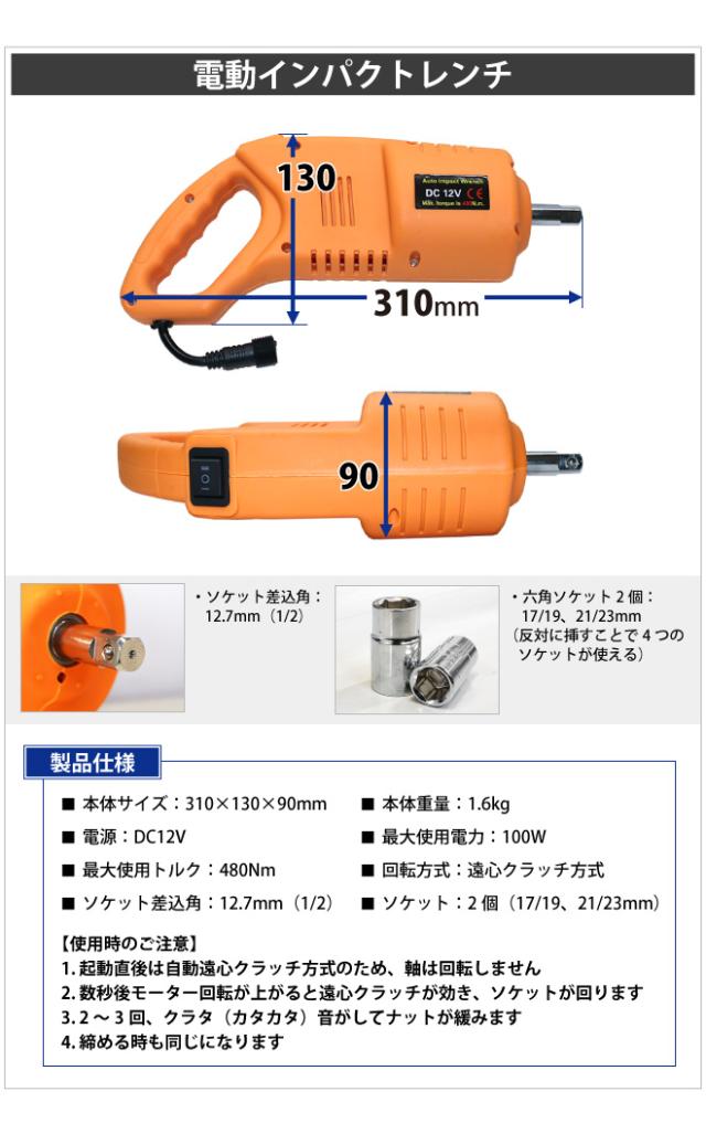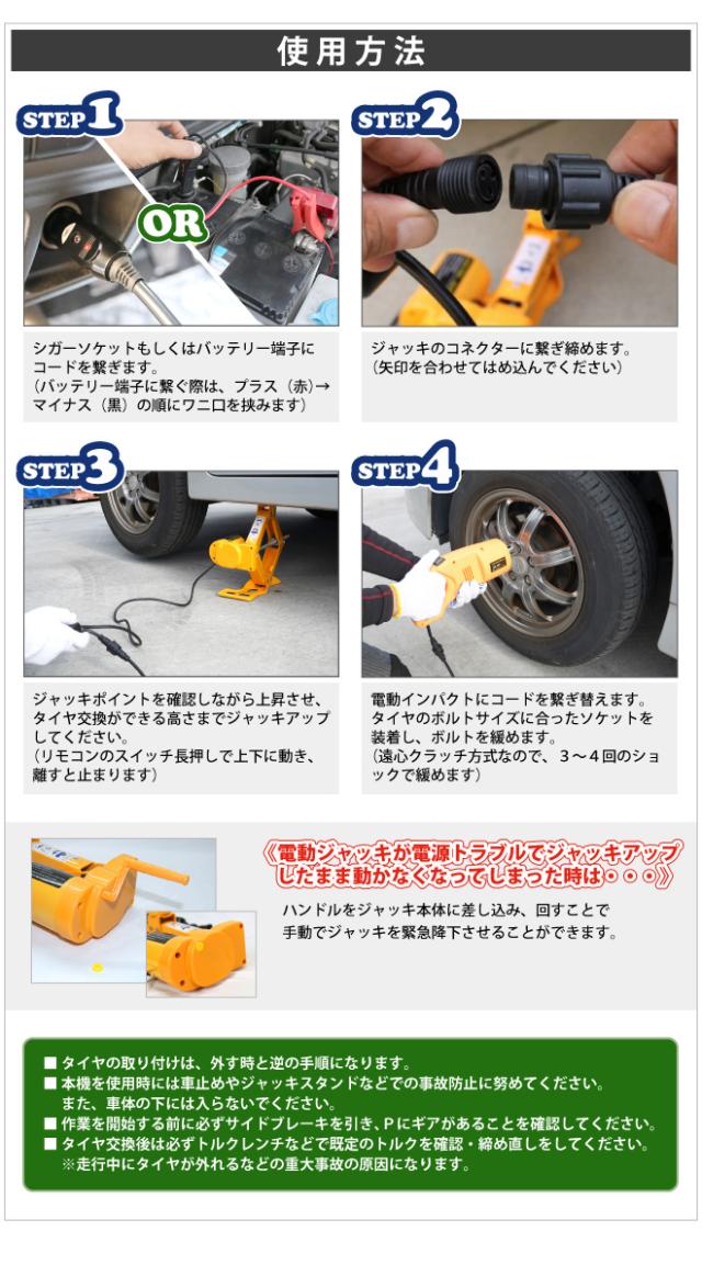 タイヤホイールの脱着を強力サポート! ●本機はDC12V車専用です ●電動ジャッキ+インパクトでセダンからハイエースクラスまでのタイヤ交換ができる ●力のいるジャッキアップやホイールナットの脱着等の作業負荷を大幅に軽減します ●電源は車のシガーソケットやバッテリー端子から取れる2WAY方式です ●専用ハードケース付きですっきり収納 ●ケース表面に警告表示版付きなので、路上での作業も安心して行えます ●車両重量2tまででご使用ください ●万が一ジャッキが上昇したまま降下しない場合でも、手動で下せるハンドル付き 【ご注意】 ・ジャッキは必ずコンクリートなどの固くて平坦な場所で使用してください ・本機を使用する際には、車止めやジャッキスタンド等を使用して事故防止に 努めてください また、車体の下には入らないでください ・タイヤ交換後は必ずトルクレンチ等で既定のトルクを確認・締め直しをしてください 走行中にタイヤが外れるなどの重大事故の原因になります 品番:JIS-1 |