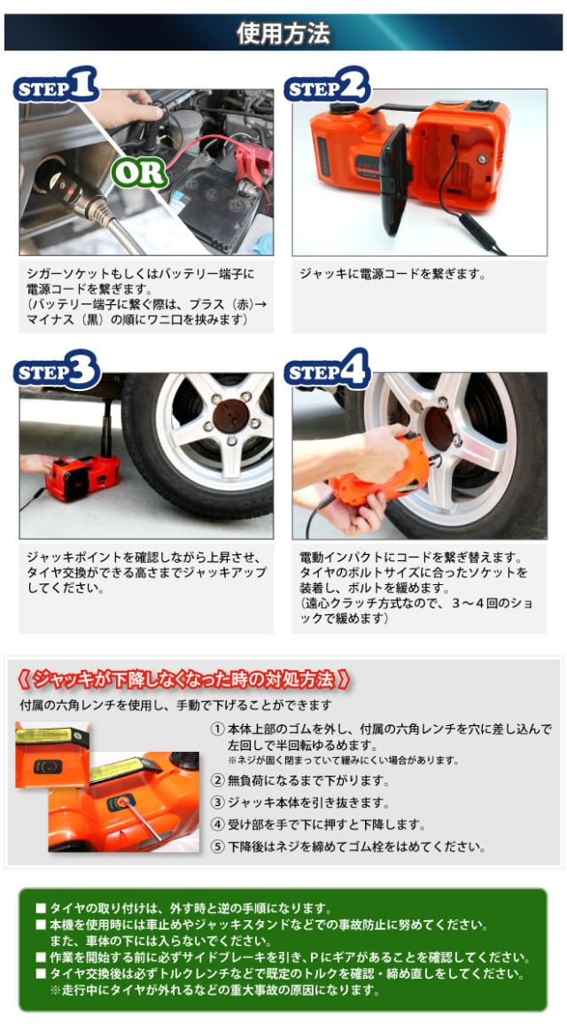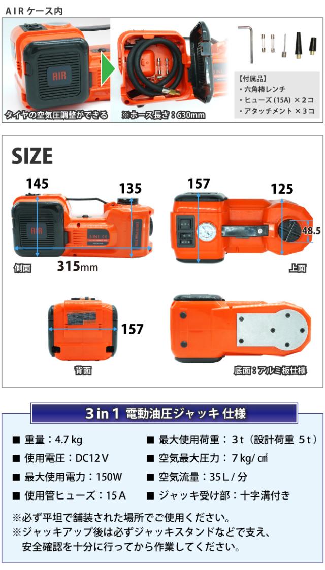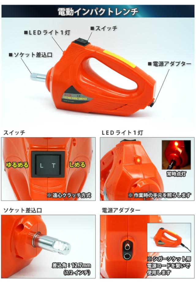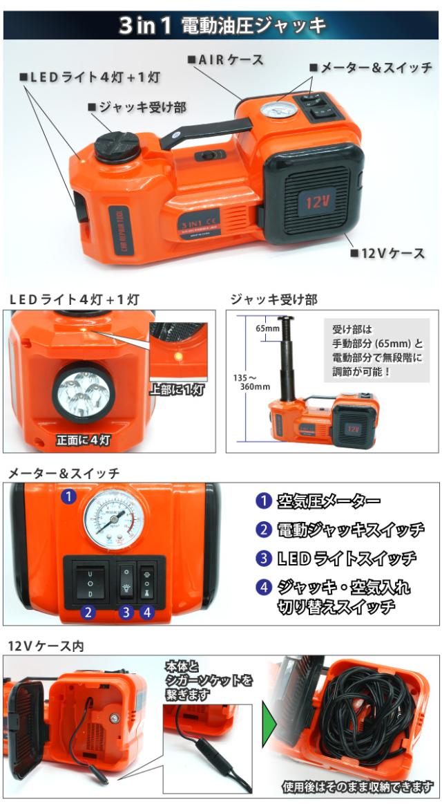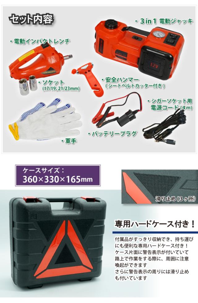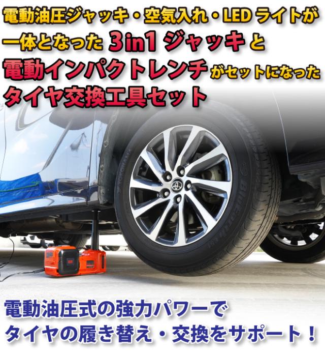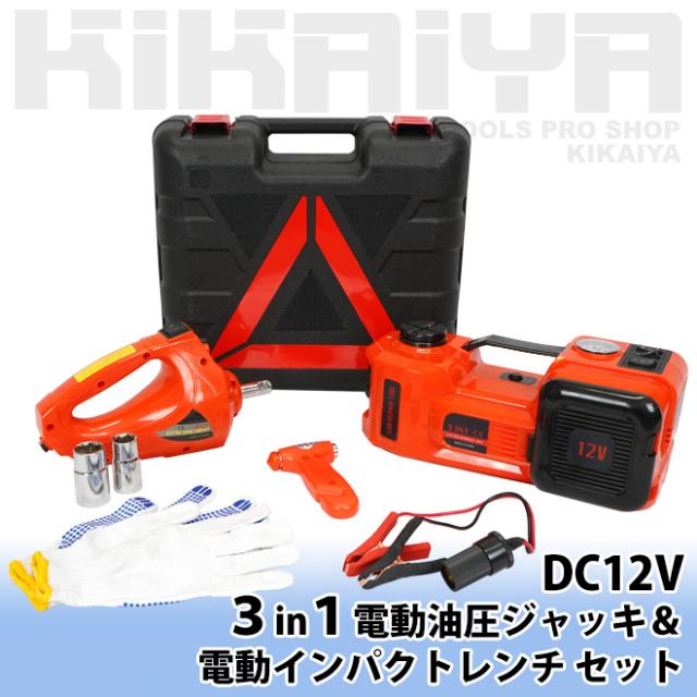 電動ジャッキ 3t インパクトレンチ セット LED内蔵 空気圧調整 空気入れ DC12V 3in1 カージャッキ タイヤ交換 KIKAIYA