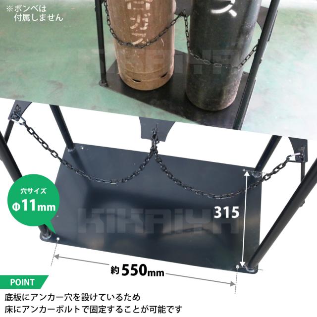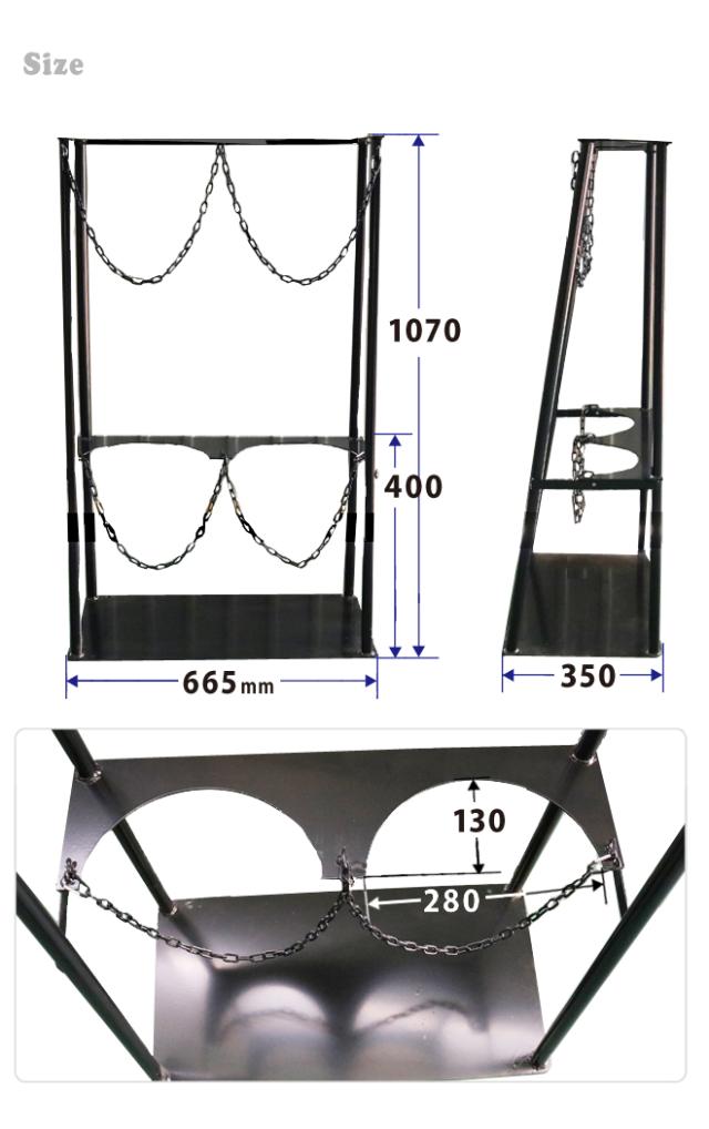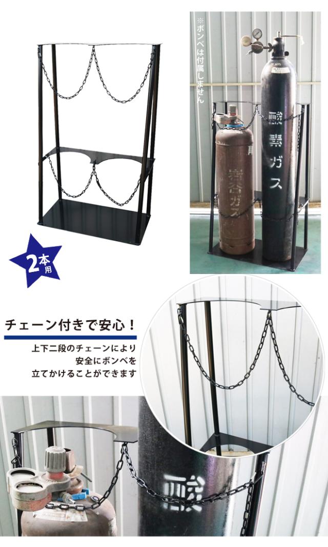 ボンベ(2本)を安全に収納できます! ●上下2段のチェーンにより、安全にボンベを立てかけることができます ●酸素、アセチレン高圧ガスボンベに使用できます ●底板、背面にアンカー穴を設けているため、床や壁などにアンカーボルトで 固定することが可能です ●商品は完成品です 【ご注意】 ・適用容器以外には使用しないで下さい ・容器はチェーンで必ず固定して下さい ・転倒防止のため、アンカーボルトで固定して下さい ☆「1本用」も別途販売しております 【ご注意】 工事中の工事現場への配達はできません。西濃運輸営業所止めとなります。予めご了承ください。 |