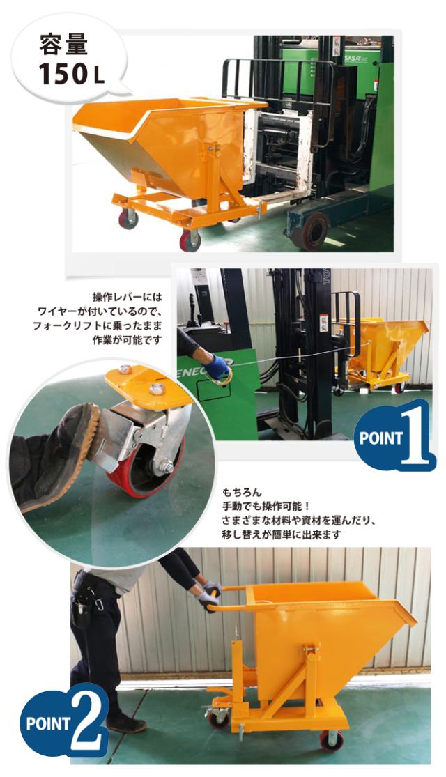 ダンプカート 150L ホッパー フォークリフト取付け用 大容量 大型 バケット台車 チルト機能付き 台車 250kg チルトトラック スクラップ台車 反転台車 KIKAIYA