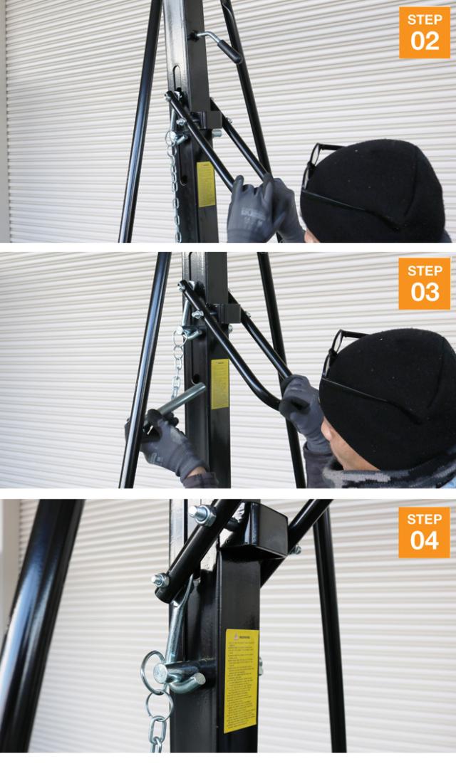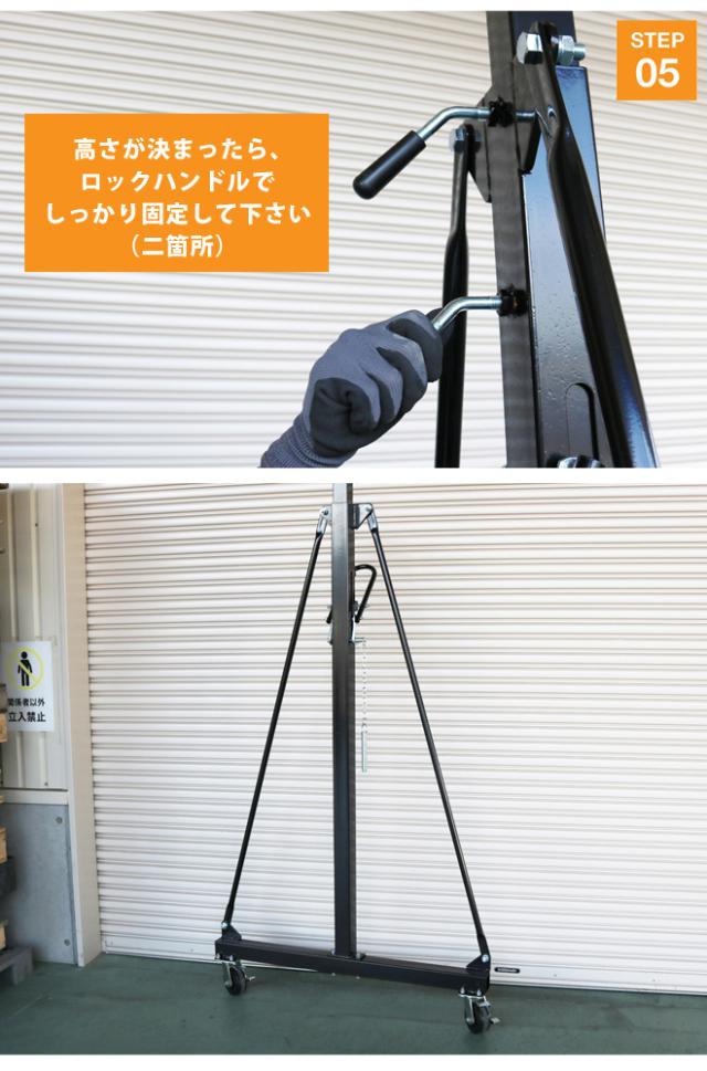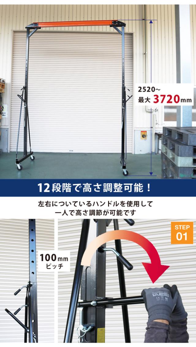 移動式門型クレーン、さまざまな物を吊り上げます! ●車輌への重量物やマリンジェット・バイクなどの積み下ろしが可能! ●ビームはI型鋼を使用しており丈夫です ●車輪は4輪全て自在でブレーキ付です ●ウレタン車輪で油にも強く樹脂床の上でも傷付けません ●左右についているハンドルを使用して一人で高さ調節も可能です ●水平なコンクリートなどの固い床の上でお使い下さい ●吊上げ作業は必ずビームのセンターで垂直に吊上げて下さい ●商品は組み立て式です ※製品の仕様変更等は承っておりません 【ご注意】 *斜め吊り使用不可!! *荷を吊った状態で移動させないでください ※本製品は、耐荷重1000kgでの製造ですが、安全上、使用荷重500kgとして販売しております 品番:EC-6 |