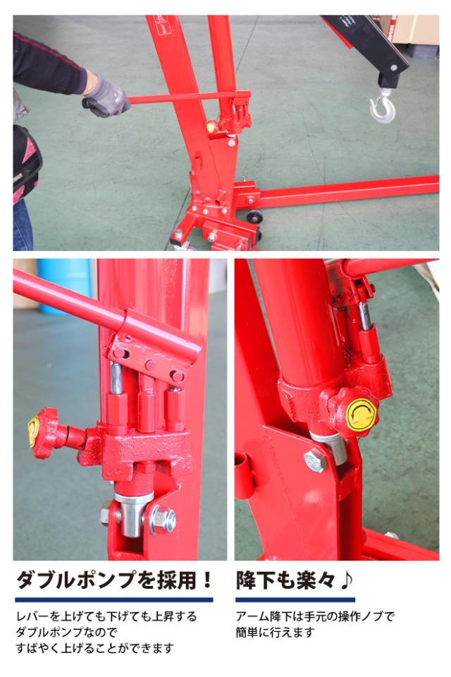 超低床脚部ハイパワークレーン強力タイプ! ●大きく重厚な造りとロングビームで、余裕の吊り上げ高さが特長の エンジンクレーンです ●超低床脚部ハイパワークレーン強力タイプ ●荷の位置保持ではなく、荷の吊り上げ専用としてご使用下さい ●最大で1トン、ビーム最大伸長時でも500kgの吊り上げ能力があります ●ビーム伸縮は3段階(125mm)間隔で調節可能です ●レバーを上げても下げても上昇するダブルポンプなので、すばやく上げることが できます(※一定以上の負荷がかかると、シングルポンプになります) ●アーム下降は手元の操作ノブで簡単に行えます ●能力以上の荷重がかかると、安全弁が作動し本体を保護します ●使わない時は折りたたんで、コンパクトに収納できます ●キャスターはベアリング入りで移動もスムーズです(補助車輪除く) ●商品は木箱入りで、お客様での組立てとなります (必要工具:モンキーレンチ) ※能力以上の荷物は吊り上げないで下さい ★ナイロンスリングのラインナップはこちら ★「エンジンハンガー900kg(EH-4)」も別途販売しております ▼保証期間:6ヶ月 使用状況によっては保証対象外となる場合がございますので返送前に 必ずお問い合わせください (保証対象:油圧系統にかぎります) (保証対象外:[例]ダメージやオーバーロードによる変形・ゆがみ等、 使用による車輪の摩耗・水、塩分に起因する故障) 返送の送料はお客様負担でお願いいたします お客様によるイメージ違いでの返品は一切お受け出来ませんので予めご注意ください 品番:EC-7A |