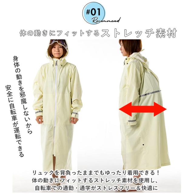 レインコート 自転車 通学 通販 ママ 学生 レディース メンズ ロング 通学用 無地 シンプル 反射材 ライン リフレクター フード付き リュック対応 防水 撥水 軽量 軽い 透湿 蒸れにくい 伸縮 ストレッチ KOYANAGI コヤナギ レインウエア