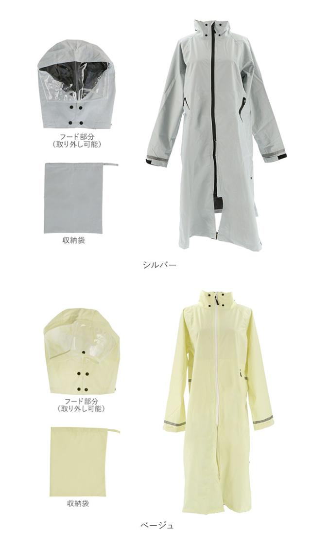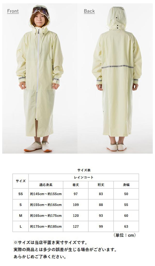 | 注意点 | ※ご使用後は乾いた布で拭きとり、直射日光を避けて日陰干しをし、風通しのよい所に保存してください。 ※汚れは中性洗剤か、ぬるま湯で優しく手洗いしてください。汚れがひどい場合は、表面は柔らかいブラシを使い裏面はコーティングを傷つけないようスポンジなどで汚れを落としてください。 ※洗濯機、ドライクリーニング、乾燥機のご使用はお避けください。 ※ポケットの中に防水性はありません。 [自転車使用時のご注意] ※自転車との組み合わせによってレインコートの裾や、レインウェアの調整紐が駆動部に接触し巻き込まれる可能性があります。ご使用の際には、レインウェアと駆動部が接触しないようにご注意ください。 ※レインウェアの収納袋を前かごに入れて運転する場合、前かごの目が粗いと、収納袋の口をしめる調整紐が垂れ下がる場合があります。垂れ下がった調整紐が駆動部に接触した場合、巻き込まれて駆動部が停止し転倒する可能性があるので、短く束ねてご使用ください。 ※使用する前に、フードを調節し首を左右に振った際に視界が遮られることがないか確認してください。 ※レインウェア着用後の自転車乗降時は、レインウェアが自転車に引っかかり転倒する恐れがありますので注意してください。 |